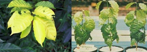 Thiếu đạm (N) làm cho lá cà phê vàng, bắt đầu từ giữa lá sau đó lan dần ra toàn bộ lá, lá già vàng trước sau đó đến các lá non, thiếu đạm còn làm cho cây cằn cỗi, cành ngắn, ít chồi non, trái nhỏ, năng suất kém.