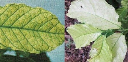 Vàng lá do thiếu Magiê khác với vàng lá do thiếu Kali ở chỗ gân lá vẫn xanh, chỉ vàng các phần thịt lá, còn thiếu K sẽ làm cho lá vàng toàn bộ, cả phần gân lá