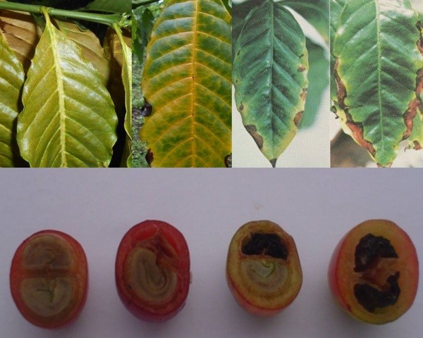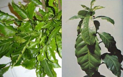 Chùm lá non trên ngọn chuyển vàng, lá mỏng thì đây là triệu chứng thiếu lưu huỳnh. Thiếu lưu huỳnh thường xảy ra ở cà phê kiến thiết cơ bản, vườn cà phê kinh doanh ít bị thiếu do nhà vườn thường có sử dụng phân SA hay NPK có chứa lưu huỳnh.