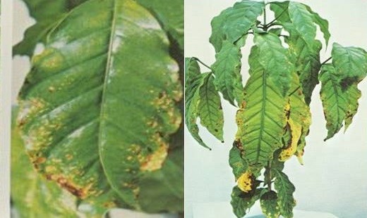 Cây cà phê còi cọc, chồi non yếu, teo dần, bị nấm bệnh tấn công nhiều.