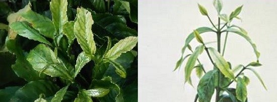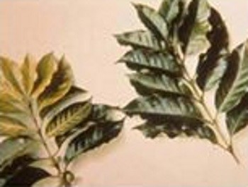 Lá non vàng trắng nhưng còn những đường gân mờ xanh nhưng kích thước lá không quá nhỏ (như thiếu kẽm), cây kém phát triển, năng suất và chất lượng cà phê thấp.