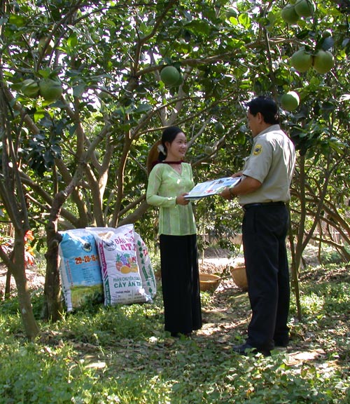 - Bón vôi và vi lượng: Hàng năm vào đầu mùa mưa nên bón khoảng 500 kg/ha phân vôi để cung cấp Ca và Mg cho đất. Những loại phân NPK có chứa dưỡng chất trung và vi lượng chuyên dùng cho cây ăn trái được khuyến cáo sử dụng cho vườn cây ăn trái ở Đồng Bằng Sông Cửu Long và phải bón phân đúng vào vùng rễ đang hoạt động của cây (theo hình chiếu của tán).