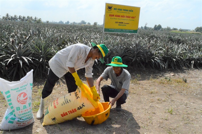 Nông dân sử dụng phân bón Đầu Trâu 46A+ để bón cho cây khóm, hạn chế được hiện tượng cháy đọt, mang lại hiệu quả cao.