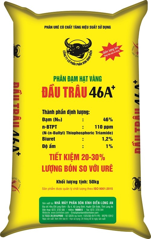 Đầu Trâu 46A+ là phân đạm Ure được bọc với chế phẩm Agrotain, là chất có tác dụng làm giảm thất thóat N. Trên phạm vi thế giới, chế phẩm Agrotain, từ lâu đã được ứng dụng vào sản xuất nông nghiệp ở nhiều nước. Ở điều kiện nước ta, chế phẩm này được công ty Cổ phần phân bón Bình điền đưa vào các sản phẩm phân có chứa N từ năm 2008, và đã được bà con khắp cả nước, cũng như các nước láng giềng như Lào, Cambodia, Myanmar phấn khởi đón nhận. Hàng năm Bình điền đã cung cấp cho bà con nông dân khoảng 65-70.000 tấn dạng đạm này, chưa kể chế phẩm Agrotain được phối trộn trong phân NPK các loại. Đánh giá trên nhiều loại cây, nhiều vụ, bình quân nếu sử dựng đạm vàng 46A+ thì đều có thể tiết gỉam được từ 20-45%, lấy bình quân trên diện rộng là khoảng 30% chất N. Điều ấy mang lại nhiều lợi ích đáng kể không những cho nhà nông mà cho cả môi trường sinh thái rất có ý nghĩa. Để mở rộng phạm vi ứng dụng tiến bộ này cho nhiều cây trồng hơn nữa,năm 2016, công ty Bình Điền Ninh Bình đã phối hợp với Viện Nông hóa thổ nhưỡng tiến hành thí nghiệm chính quy sử dụng đạm vàng 46A+ thay cho Ure, bón trên chè tại thôn Đồng Bòng, Xã Yên Lạc, huyện Phú Lương, Thái nguyên. Thí nghiệm thực hiện trên giống chè TRI 777, 5 năm tuổi,là giống chè được trồng phổ biến trong vùng. Thí nghiệm gồm các công thức sau: