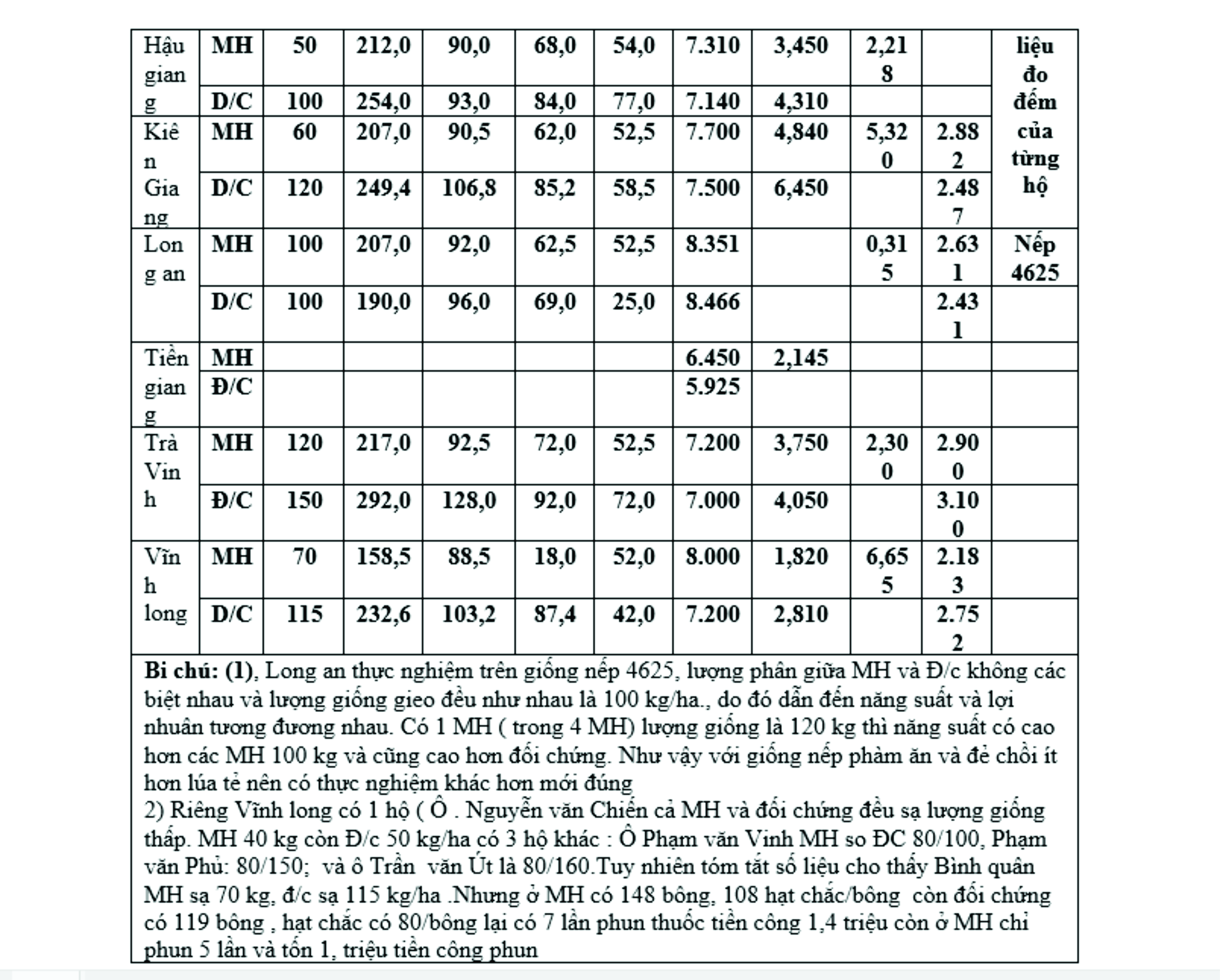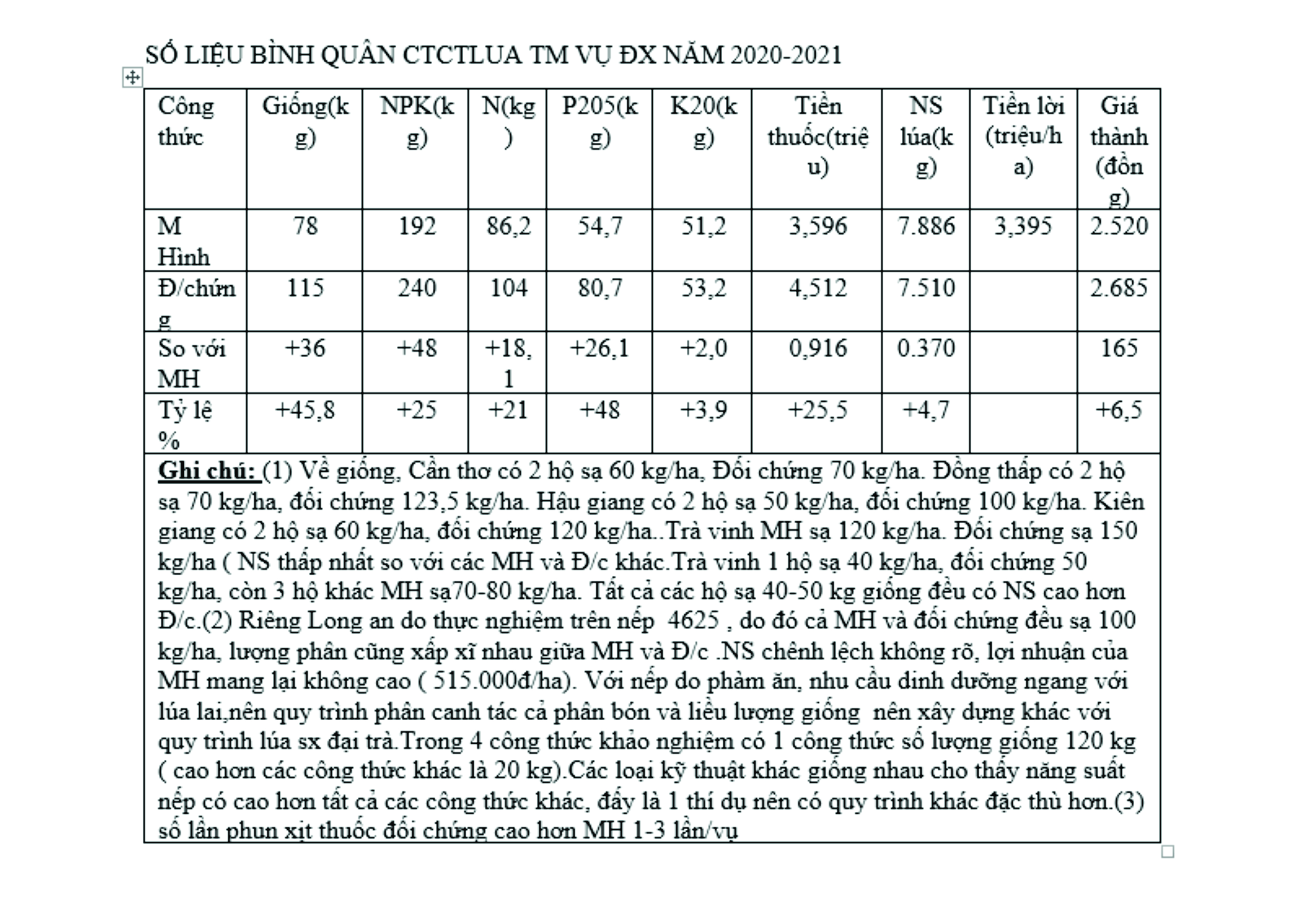 Mục tiêu chính của chương trình là so sánh các biện pháp kỹ thuật áp dụng trong Mô hình với phương pháp canh tác mà bà con đang sử dụng xem hiệu quả kinh tế mang lại hơn, kém ra sao so với yêu cầu của một nền sản xuất bền vững bao gồm: Sử dụng vật tư hợp lý, tiết kiệm, nhưng năng suất và hiệu quả kinh tế cao, ổn định môi trường phải bảo đảm trong sạch, sản phẩm nông nghiệp tạo ra phải phù hợp với tiêu chuẩn của khách hàng khác nhau trên thế giới và cả trong nước. Dưới đây là tóm tắt các kết quả thu được. Tính chung cho cả 8 tỉnh có 32 hộ tham gia thành 32 mô hình .Vật tư Nông nghiệp và các thiết bị đo độ mặn, độ phèn hay cảm biếm theo giỏi mực nước trong ruộng cũng như kỹ thuật quản lý nước, sâu bệnh và chăm sóc tổng hợp đều do công ty Cổ phần phân bón Bình điền chu cấp và hướng dẫn.Kết quả cho thấy: Về lượng giống gieo sạ bình quân 32 mô hình là 78 kg/ha, đối chứng làm theo kỹ thuật của bà con sạ là 115 kg/ha, cao hơn trong mô hình 36 kg ( chiếm 48,5%). Về phân bón: mô hình sử dụng loại phân Đầu Trâu mặn phèn và 2 chủng loại NPK chuyên dùng cho lúa là ĐT NPK TE-A1 và TE-A2 so sánh với nền phân bà con tự chọn thì tổng lượng NPK làm theo kỹ thuật của bà con bình quân 32 địa điểm cao hơn lượng NPK trong mô hình là 48kg ( hay 25%) đặc biệt là liều lượng N ruộng đối chứng cao hơn ruộng trong mô hình là 18,1 kg N ( chiếm 21%) hay 39 kg Ure/ha. Nhưng bình quân năng suất lúa của cả 32 hộ làm trong mô hình vẫn cao hơn đối chứng là 370 kg thóc/ha ( 4,7%) tiền lời mang lại cao hơn đối chứng là 3,395 triệu đồng /ha. Các tỉnh có tiền lời mang lại cao là Cà Mau: 5,666 triệu; Cần Thơ 7,515 triệu , Kiên Giang 5,320 triệu và Trà vinh là 6,655 triệu/ha. Tỉnh có tiền lời thấp nhất là Long an chỉ có 315.000 đ/ha. Lý do chính là sử dụng quy trình của lúa tẻ áp dụng cho lúa nếp 4625 là chưa phù hợp. Vì lúa nếp phải áp dụng theo quy trình của lúa lai mới phù hợp:Tức là liều lượng và tỷ lệ phân phải phù hợp, lượng giống sạ cũng cần điều chỉnh, do lúa nếp tỷ lệ đẻ chồi thấp hơn lúa tẻ nên lượng giống cũng cần phù hợp. Trong thí nghiệm cùng một mức phân nhưng ruộng sạ 120 kg cho năng suất cao hơn ruộng sạ 100 kg là 1.245 kg lúa tươi ( độ ẩm khoảng 25%) là một thí dụ cần được xem xét. Các giai đoạn chăm sóc và khống chế cũng cần làm theo đặc điểm của giống lúa nếp khác với lúa tẻ.Về mô hình, khi phân tích chi tiết cho thấy các ruộng cho năng suất cao, lời nhiều là do áp dụng đúng kỹ thuật của chương trình đã xác định , bao gồm lượng giống sa. Các hộ sạ 50kg /ha như ở Hậu Giang hay sạ 60, 70 kg như Cần Thơ Kiên Giang và đặc biệt là Vĩnh Long, cả 4 hộ đều sạ lương giống thấp, và bón tiết kiệm phân Đầu Trâu đều cho năng suất và hiệu quả kinh tế cao. Ví dụ, ở Vĩnh Long có hộ ông Nguyễn Văn Chiền trong mô hình cấy tay tốn 40 kg kg, đối chứng 50 kg/Ha mà năng suất và hiệu quả lại cao hơn so với ruộng sạ 160 kg/ha của hộ ông Trần văn Út cũng trong điều kiện đất và nước khá giống nhau. Phân tích các yếu tố tạo năng suất và hiệu quả cao là sử dụng lượng phân hợp lý của Đầu trâu, sạ lượng giống theo quy trình và thấp hơn quy trình đã làm cho cây lúa ít sâu bệnh, sinh trưởng tốt sữ dụng năng lượng mặt trời có hiệu quả cao, dẫn đến năng suất cao tiền lời cao,mang lại hiệu quả cao, đặc biệu môi trường đất nước được cải thiện: độ chua giảm, pH được nâng cao , sử dụng ít thuốc sâu bệnh hơn, trong mô hình phun xịt thuốc giảm đến 3 lần và tiết kiệm tiền thuốc được 910.000 đ/ha.Tâm lý của bà con là sạ dày để có nhiều bông làm cho năng suất cao. Đấy là quan niệm sai lầm. Ví dụ, cũng ở Vĩnh long, bình quân trong mô hình sạ 70 kg/ha , ngoài mô hình sạ 115 kg ( có hộ sạ 160kg) Ta thử so sánh hơn kém giữa mô hình và đối chứng theo các số liệu trong bảng dưới: