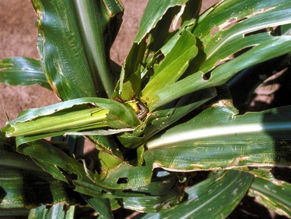 Triệu chứng gây hại trên cây ngô của sâu keo mùa thu Spodoptera frugiperda