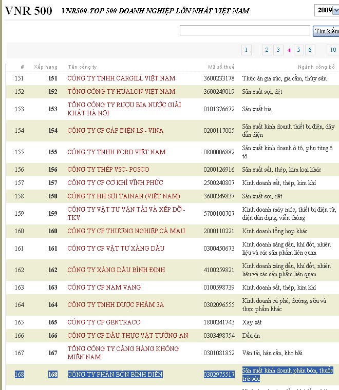Bảng xếp hạng VNR500 năm 2009 chính thức được công bố - Bình Điền xếp hạng 168 trong Top 500 DN lớn nhất Việt Nam
