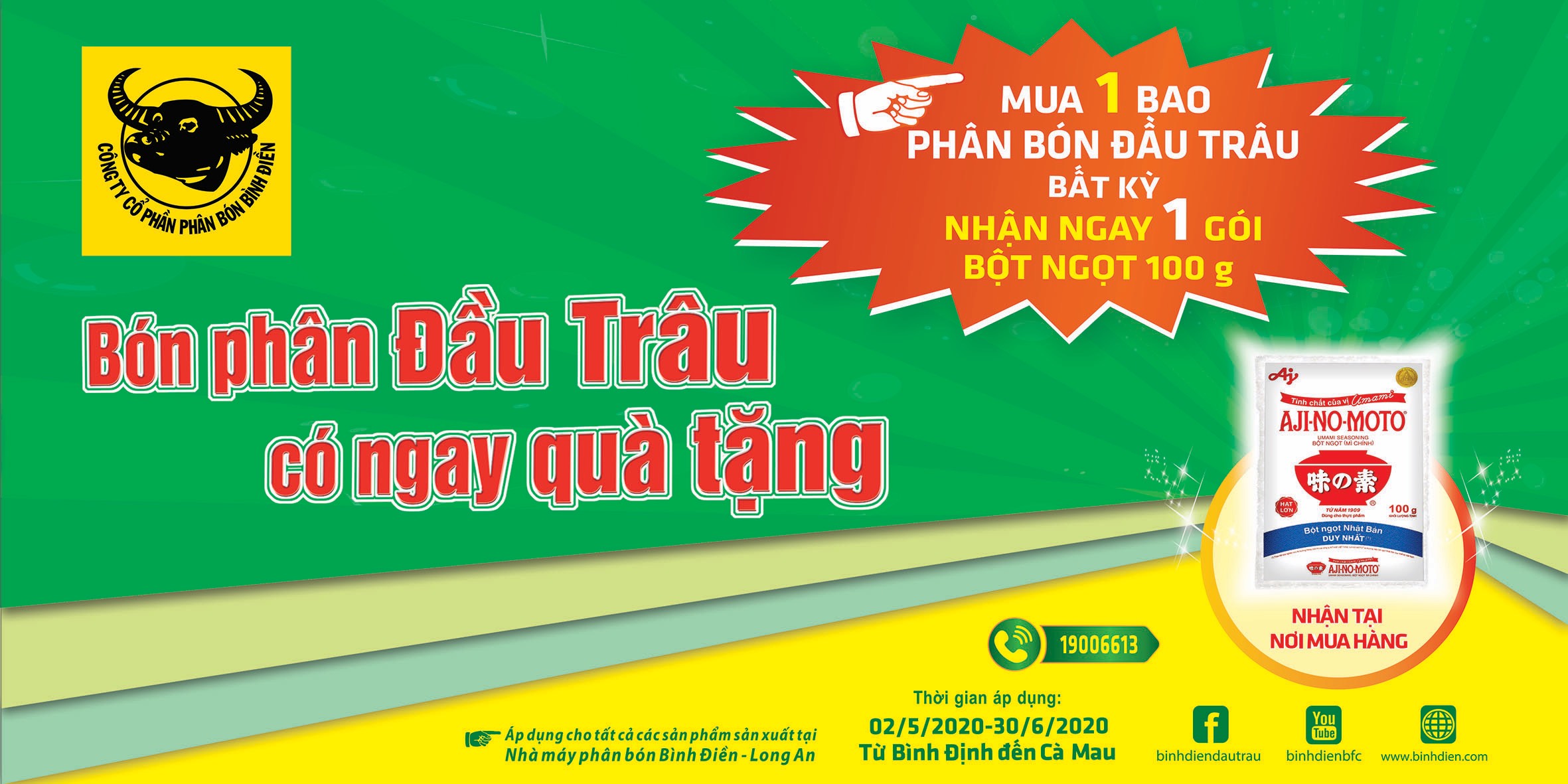 Khi mua bất kỳ 01 bao phân bón nhãn hiệu Đầu Trâu sẽ nhận ngay quà tặng là 01 gói bột ngọt Aji-no-mo-to (100 gam) tại nơi mua hàng.