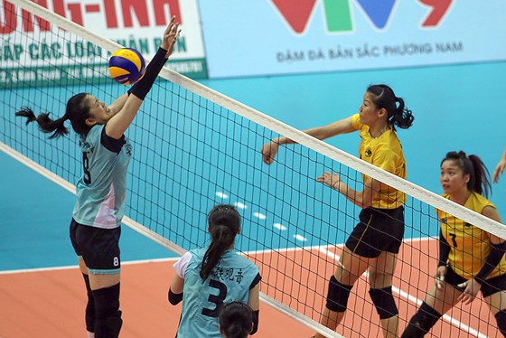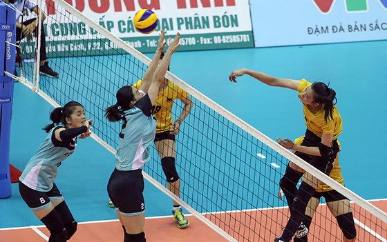 Chủ công Holly Toliver nỗ lực ghi điểm trước hàng chắn Giang Tô. Ảnh: DŨNG PHƯƠNG