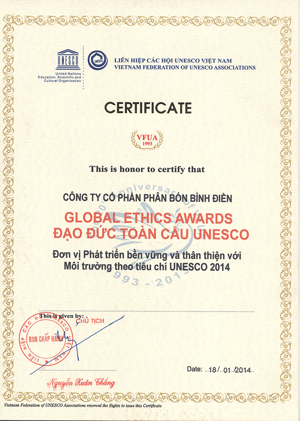 Ngày 19 tháng 01 năm 2014, tại Khu di tích Văn Miếu Quốc Tử Giám, Liên hiệp các Hội UNESCO Việt Nam đã tổ chức Lễ trao biểu tượng GLOBAL ETHICS Awards – Đạo đức toàn cầu 2014, biểu tượng Hải đăng. Công ty cổ phần phân bón Bình Điền đã vinh dự là 1/50 đơn vị nhận biểu tượng GLOBAL ETHICS Awards – Đạo đức toàn cầu 2014.