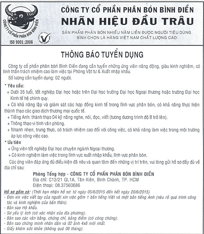 Công ty cổ phần phân bón Bình Điền tuyển dụng nhân sự