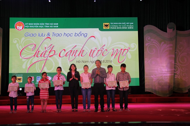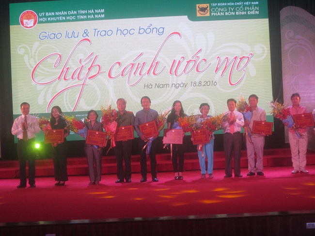 Ủy ban nhân dân, Hội Khuyến học tỉnh Hà Nam phối hợp với Cty CP Phân bón Bình Điền vừa tổ chức lễ trao 500 suất học bổng “Chắp cánh ước mơ” cho học sinh là con cán bộ, chiến sỹ đang công tác tại Trường Sa, nhà giàn DK1 và các em con nhà nghèo ham học, học giỏi trong tỉnh, mỗi suất 2 triệu đồng.