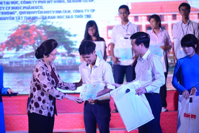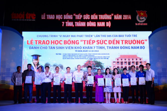 Đại biểu trao học bổng “Tiếp sức đến trường” dành cho 211 sinh viên bảy tỉnh thành Đông Nam Bộ - Ảnh: Quang Định