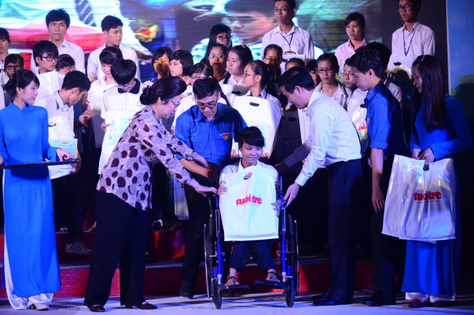 trao học bổng “Tiếp sức đến trường” cho một SV khuyết tật - Ảnh: Quang Định