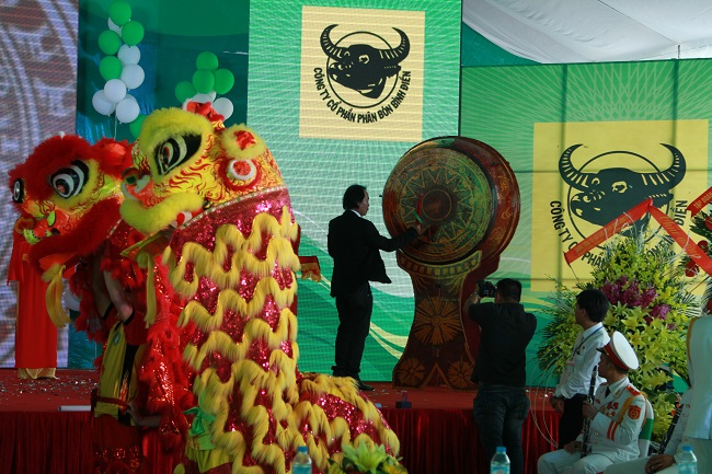 Ông Lê Quốc Phong - Chủ tịch HĐQT Công ty cổ phần Bình Điền - Ninh Bình đánh trống khánh thành Nhà máy Bình Điền - Ninh Bình