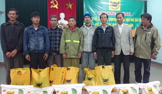 Ông Lê Bá Định (ngoài cùng bên phải) trao phân bón và lúa giống hỗ trợ nông dân Thừa Thiên- Huế.