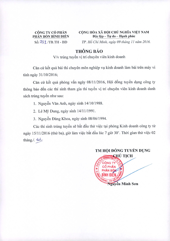 THÔNG BÁO TRÚNG TUYỂN CHUYÊN VIÊN KINH DOANH