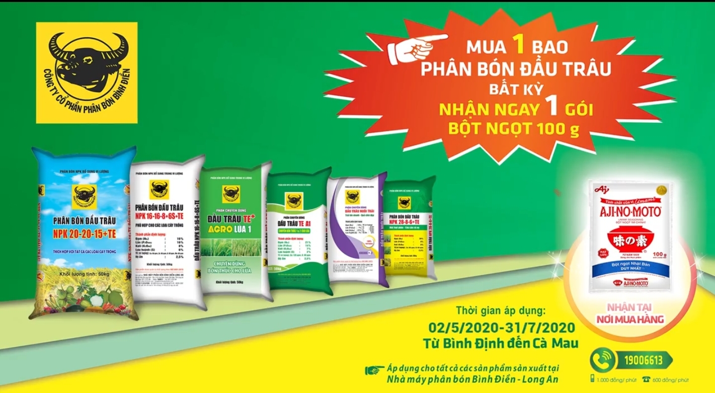 Khi mua bất kỳ 01 bao phân bón nhãn hiệu Đầu Trâu sản xuất tại Nhà máy phân bón Bình Điền Long An, bà con sẽ nhận ngay quà tặng là 01 gói bột ngọt Aji-no-moto (100 gam)