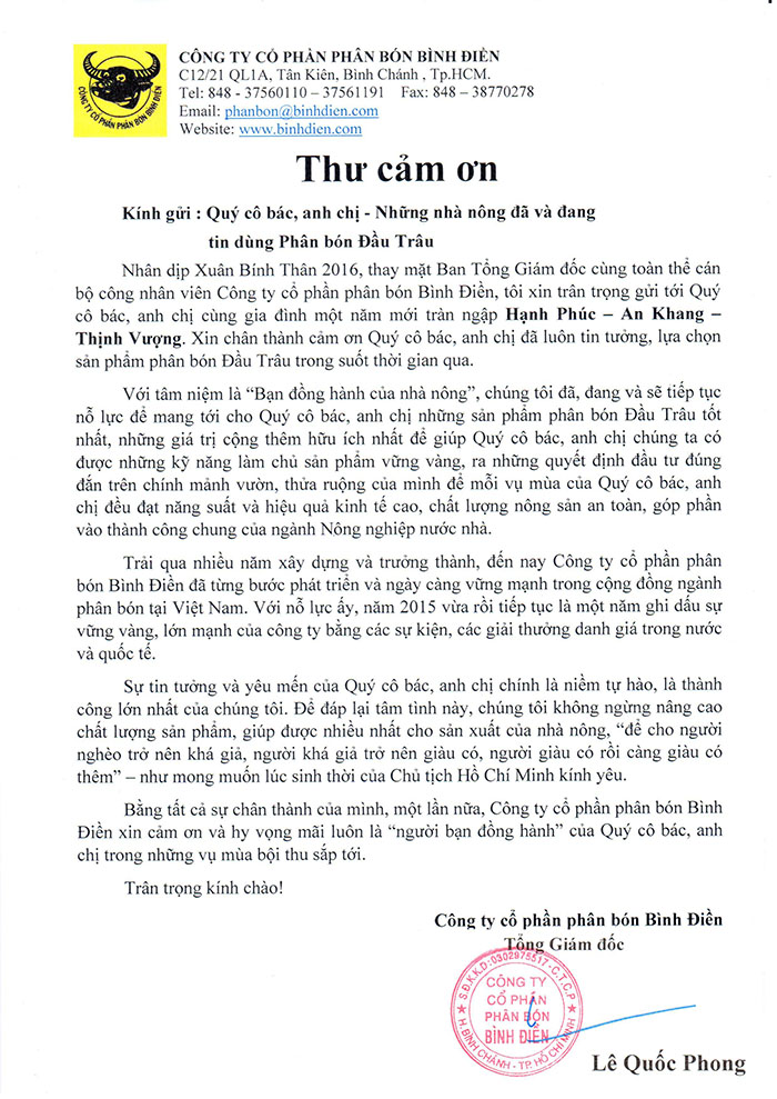 Thư cảm ơn nông dân