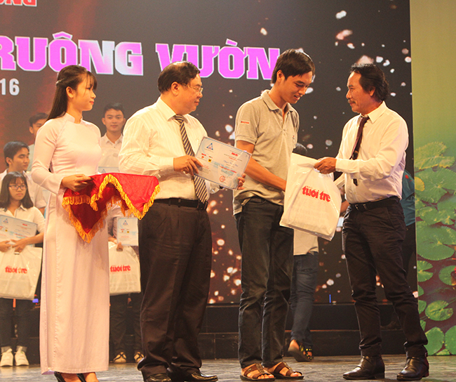 Ông Vũ Duy Hải, chủ tịch Hội đồng quản trị công ty cổ phần VinaCam khen ngợi tấm gương vượt khó của Võ Văn Kiệt và tấm lòng tận tụy vì học trò của thầy giáo Huỳnh Diệu Sanh.