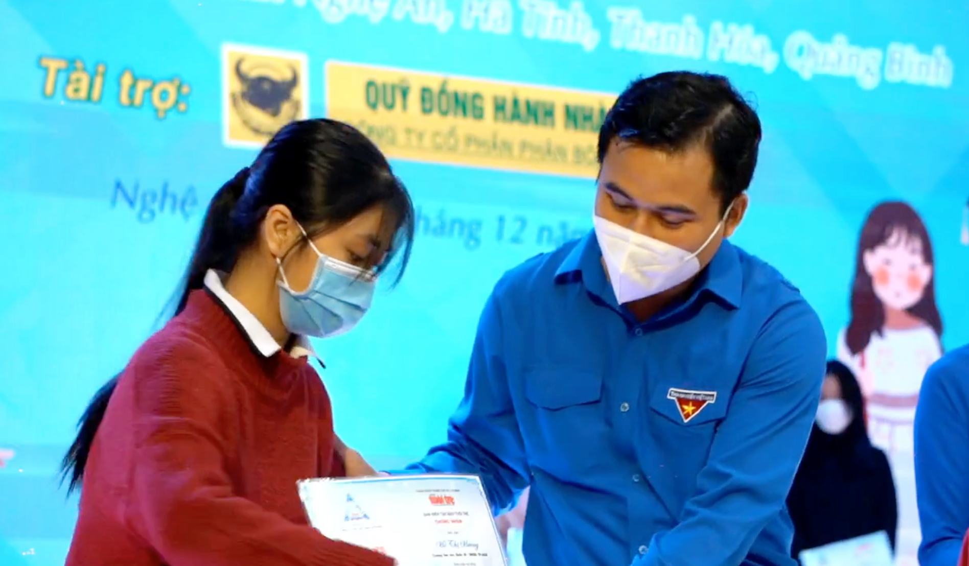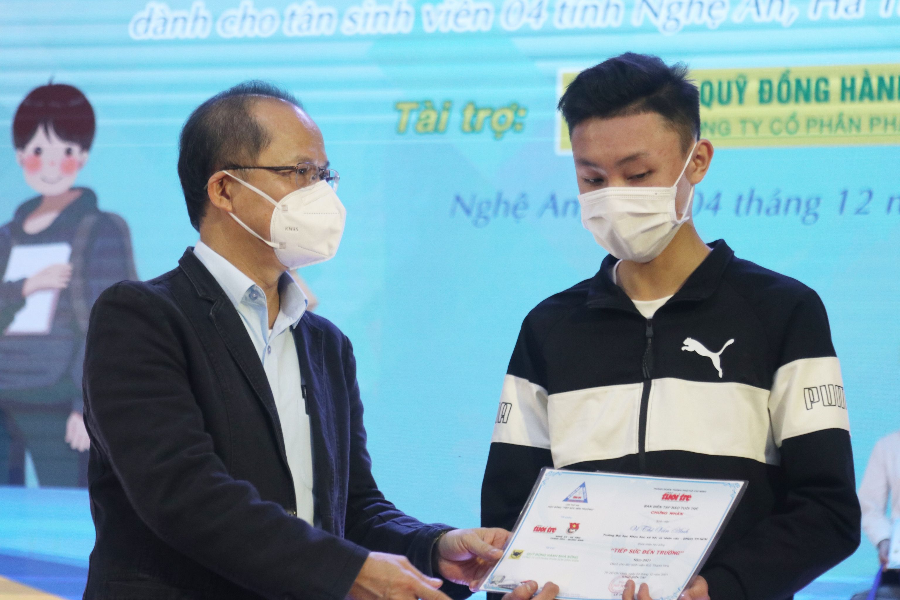 Anh Thái Minh Sỹ - phó bí thư tỉnh Đoàn Nghệ An trao học bổng cho các bạn tân sinh viên - Ảnh: DOÃN HÒA